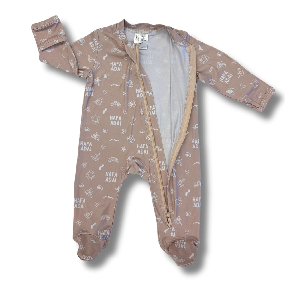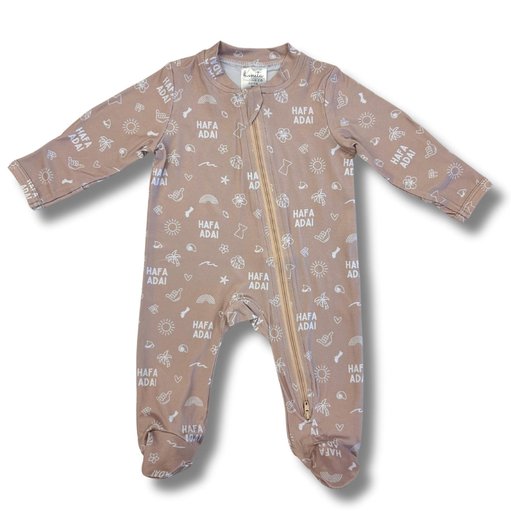 Onepiece Pajama in supersoft milk cotton fabric with neutral colored islander pattern. Features a chin guard, double zippers at front and along one leg for easy changing, mitten cuffs and covered feet.