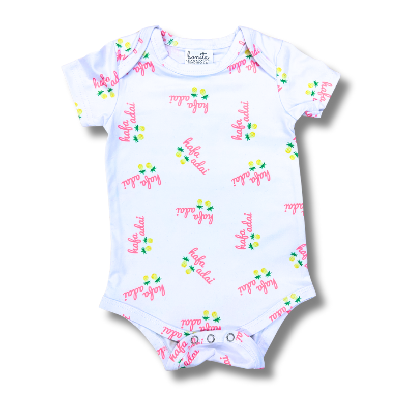 Hafa Adai Pineapple Pattern Onesies. These are made with lightweight, breathable, and soft cotton fabric for your baby. Runs big with lots of room for growth.