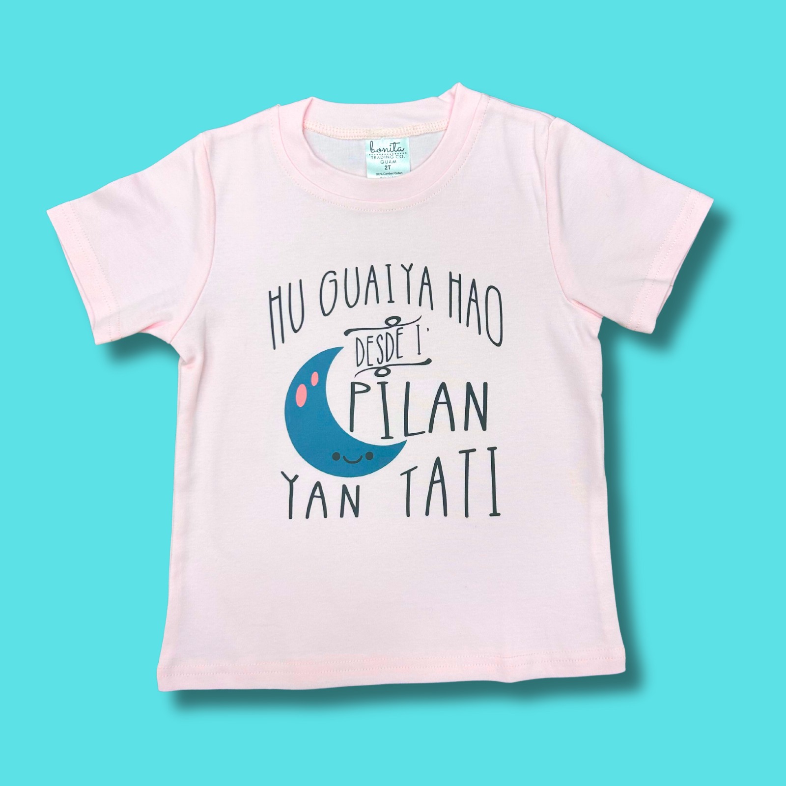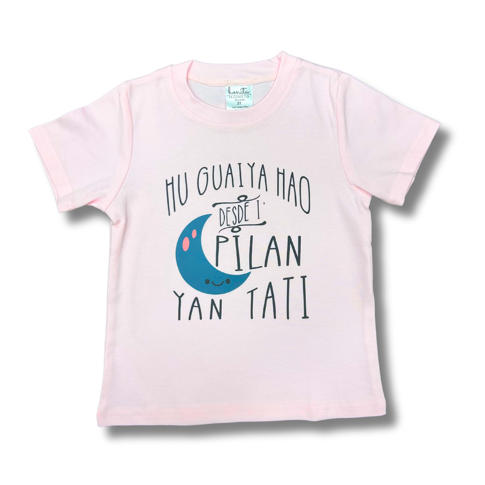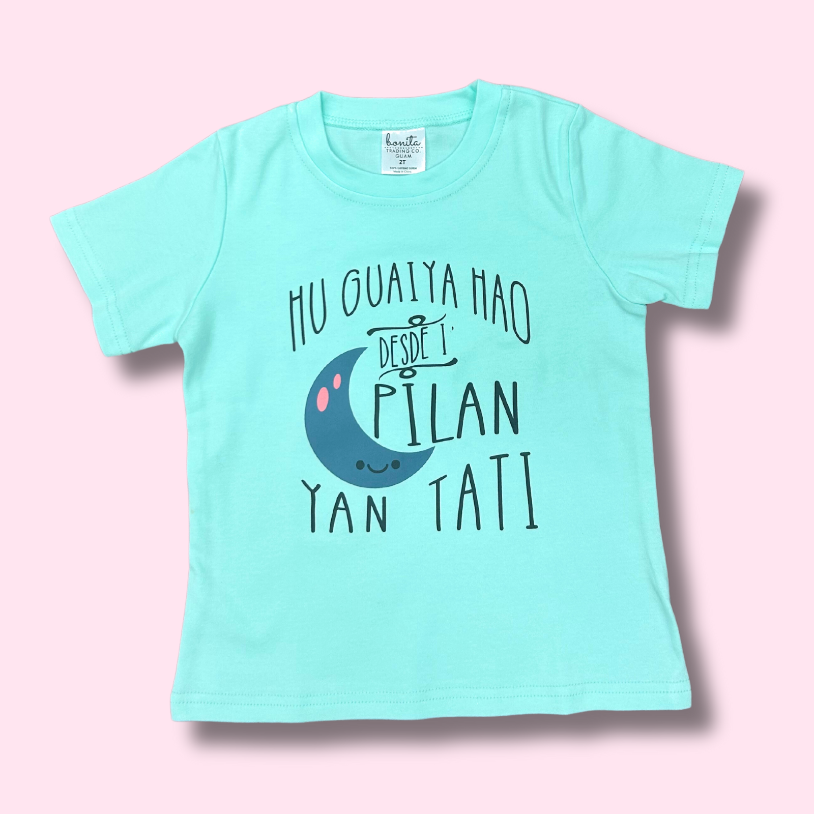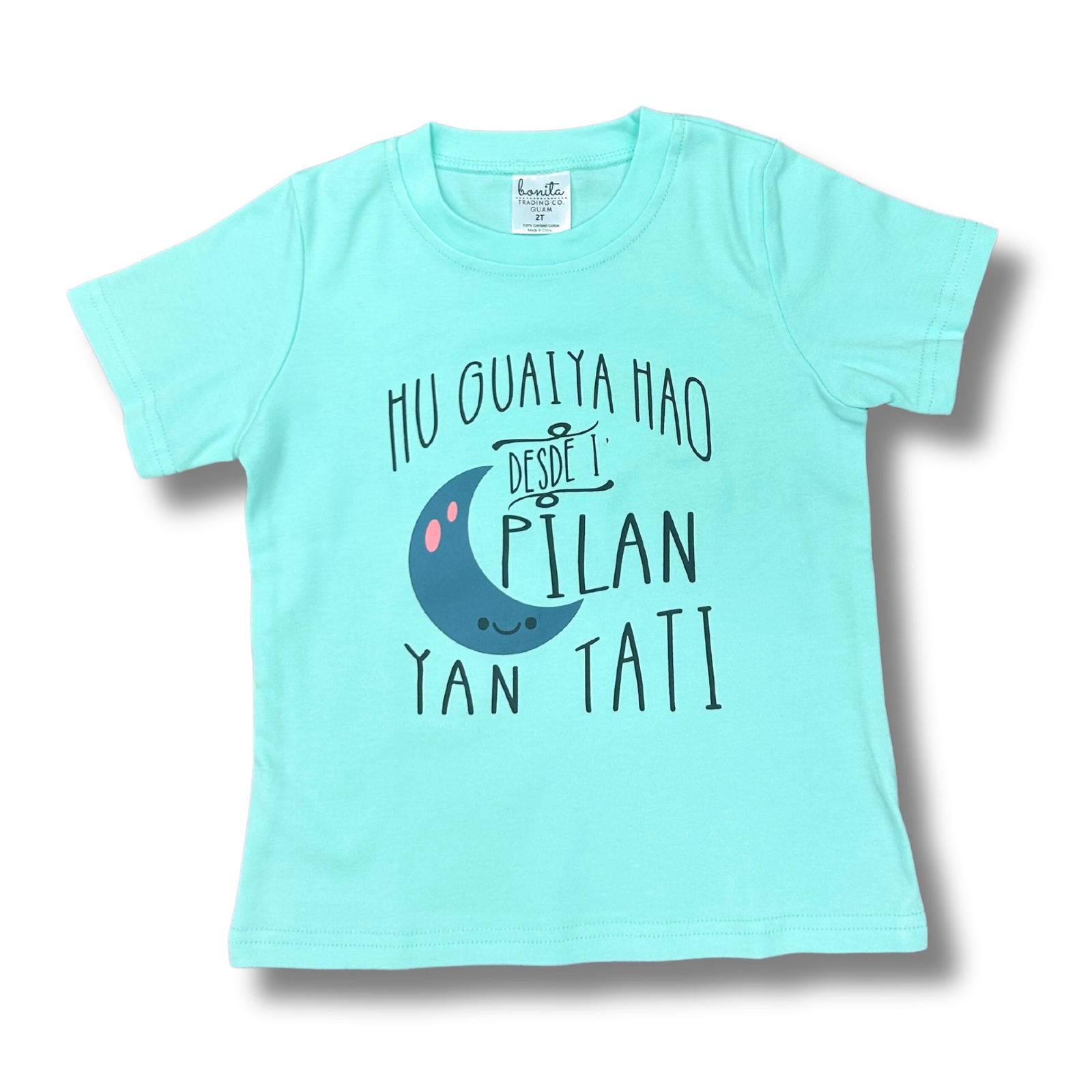 Hu Guiaya Hao desde i Pilan yan Tati means ILY to the Moon & Back in CHamoru! 100% Combed Cotton Children's Unisex Tee. Runs large for room to grow!